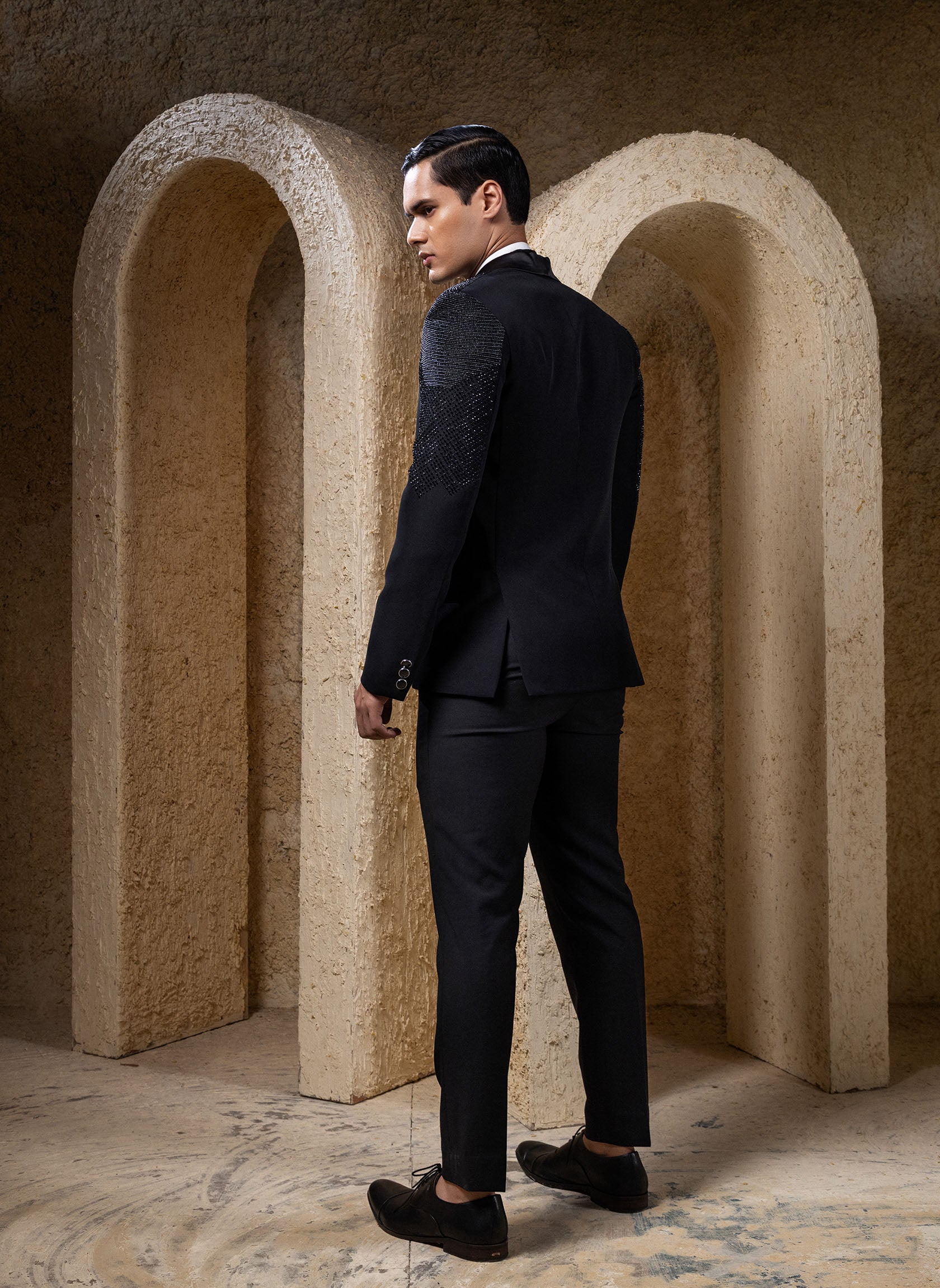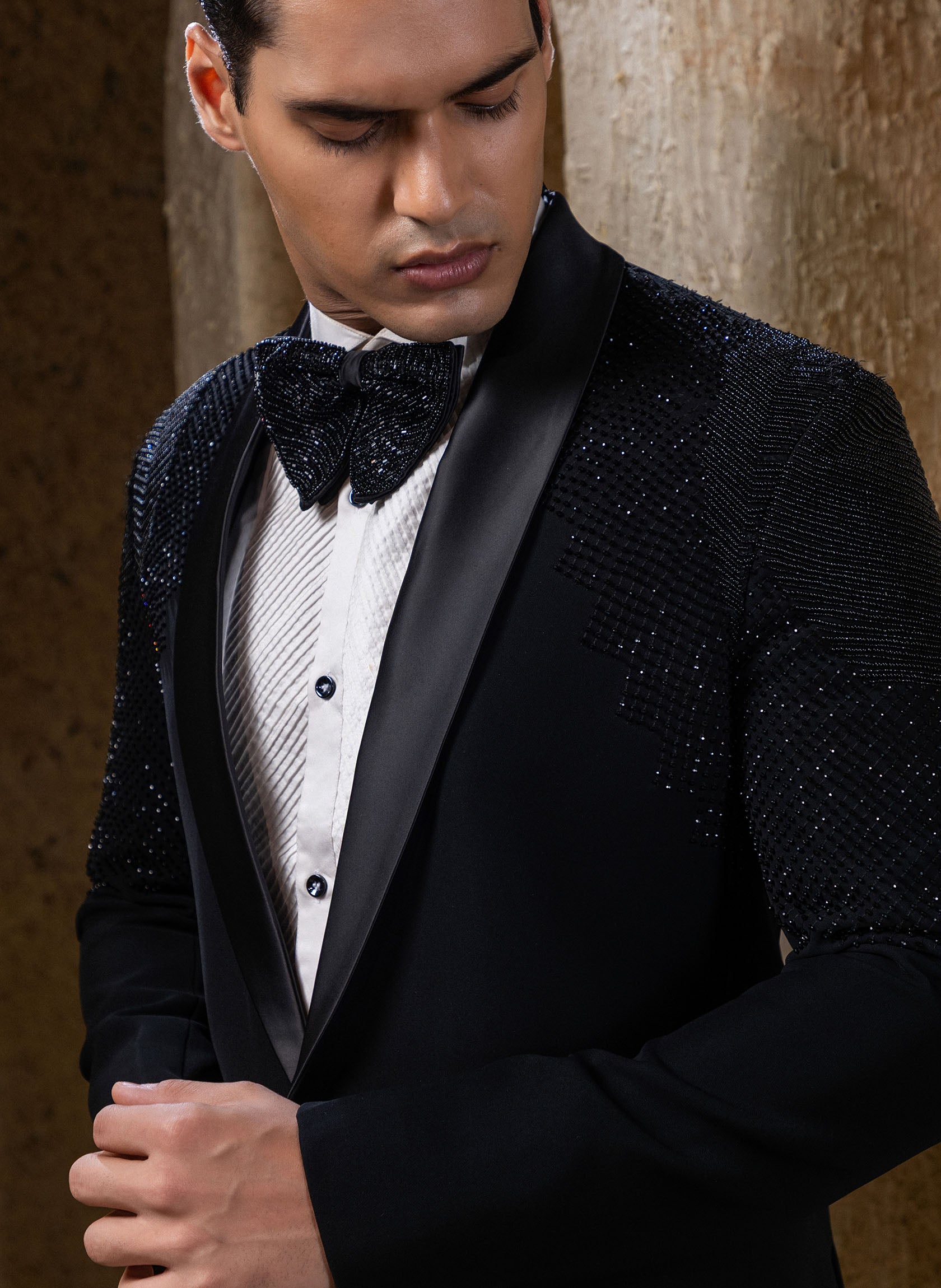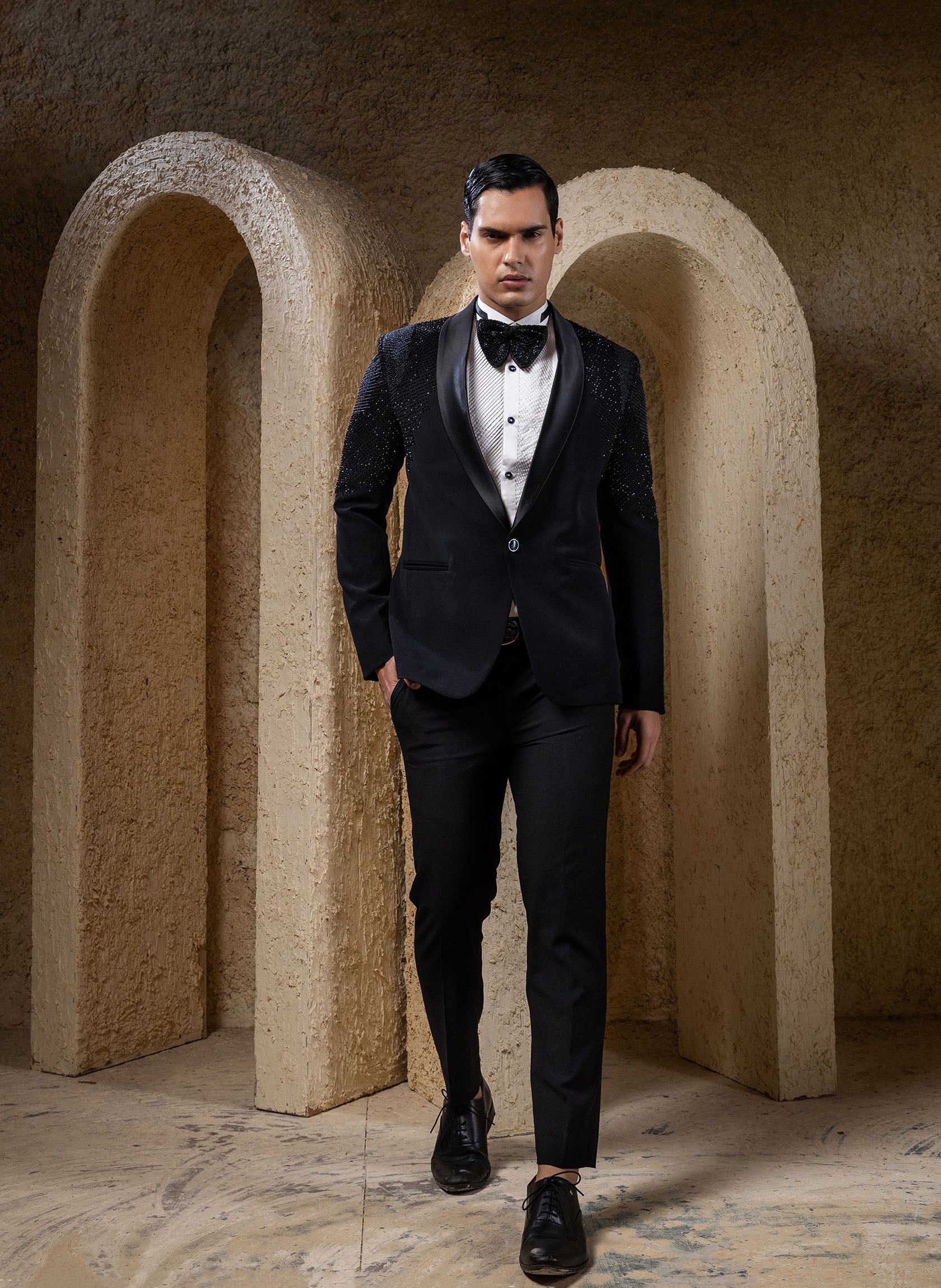 Black Tuxedo having shoulder embroidery with bugle beads and sequin. Comes with same black trousers and white shirt.