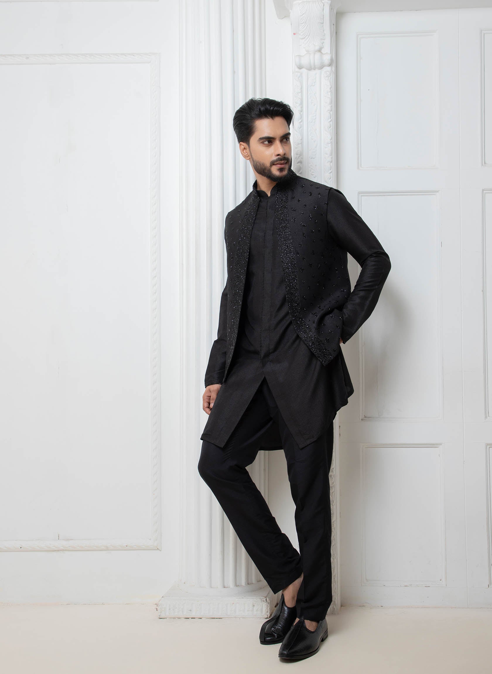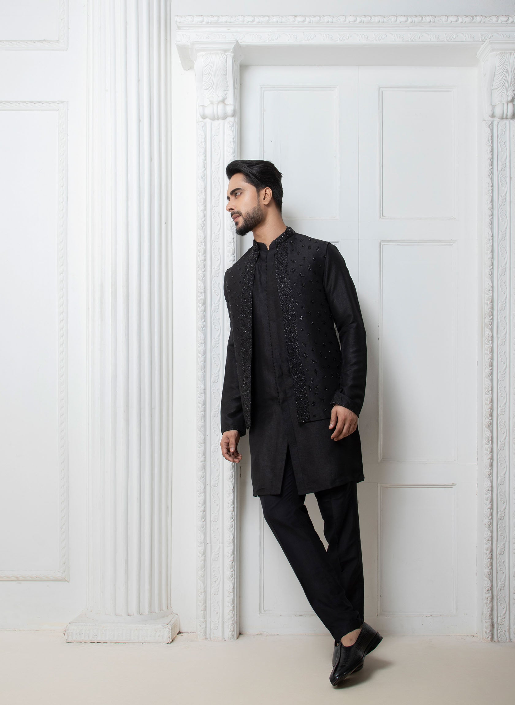 Black Open Jacket with cutdana embroidery with short kurta and straight pants.