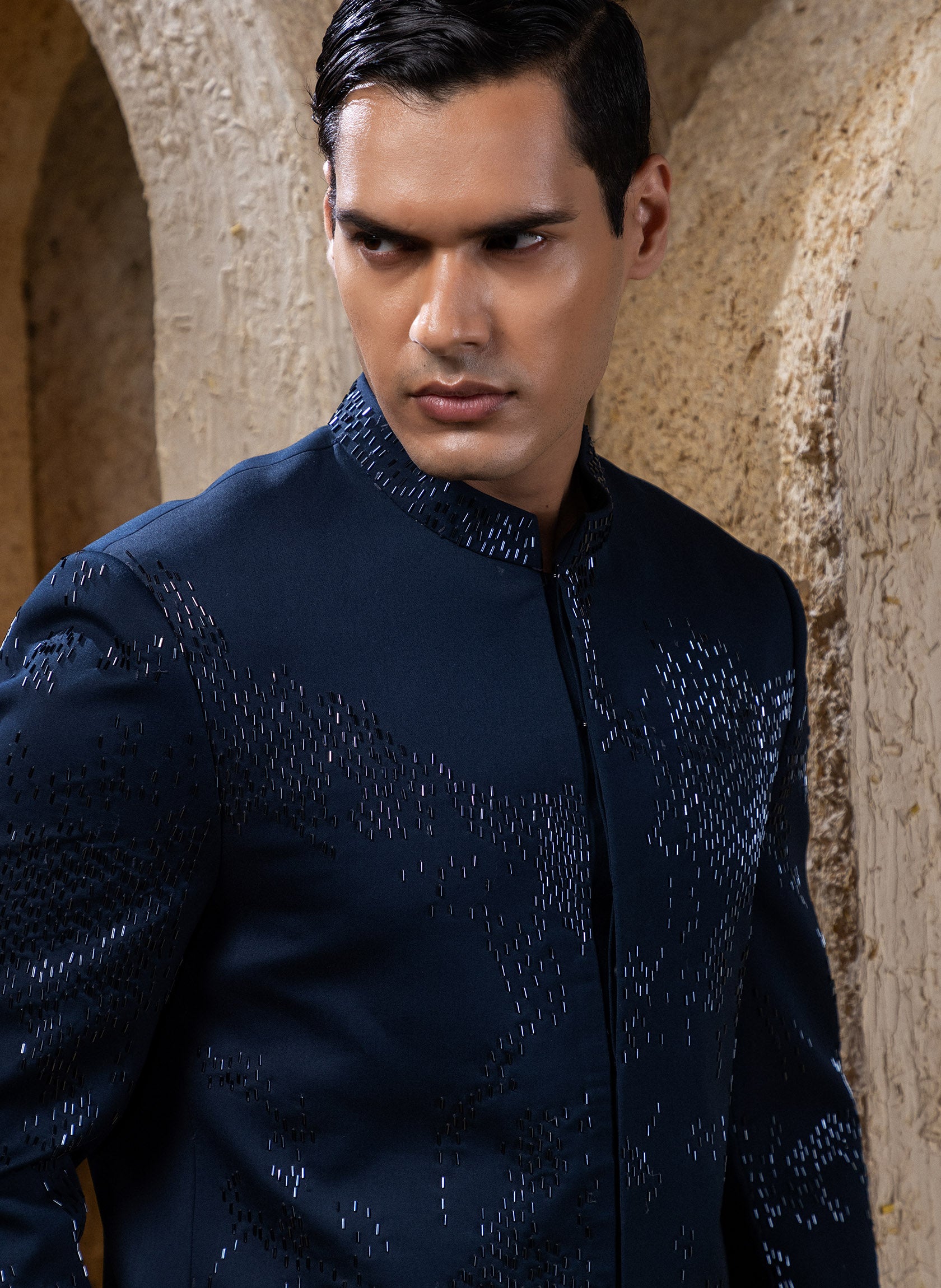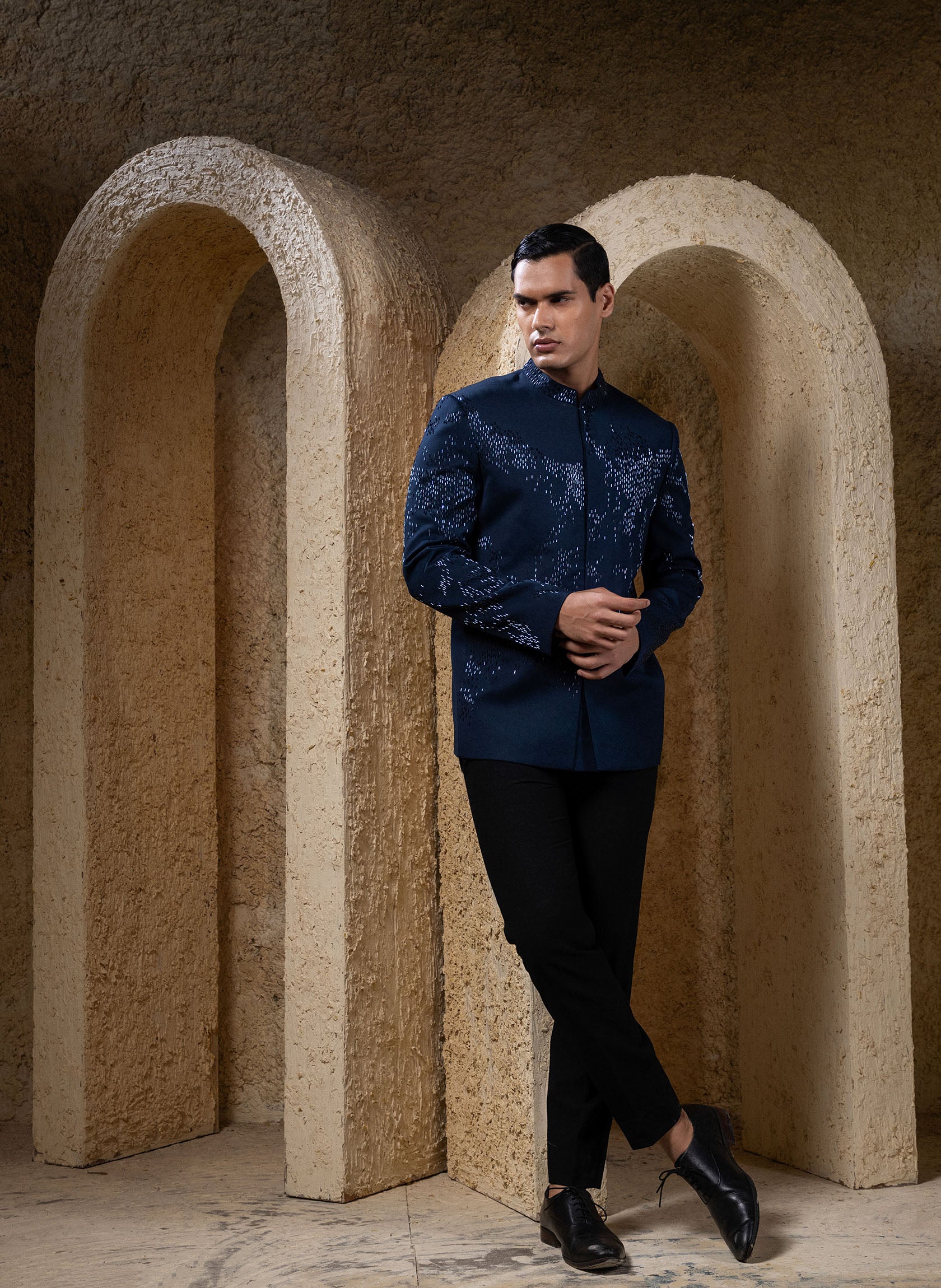 Navy blue embroidered Bandhgala with cutdana embellishment. Comes with Fitted Trousers.