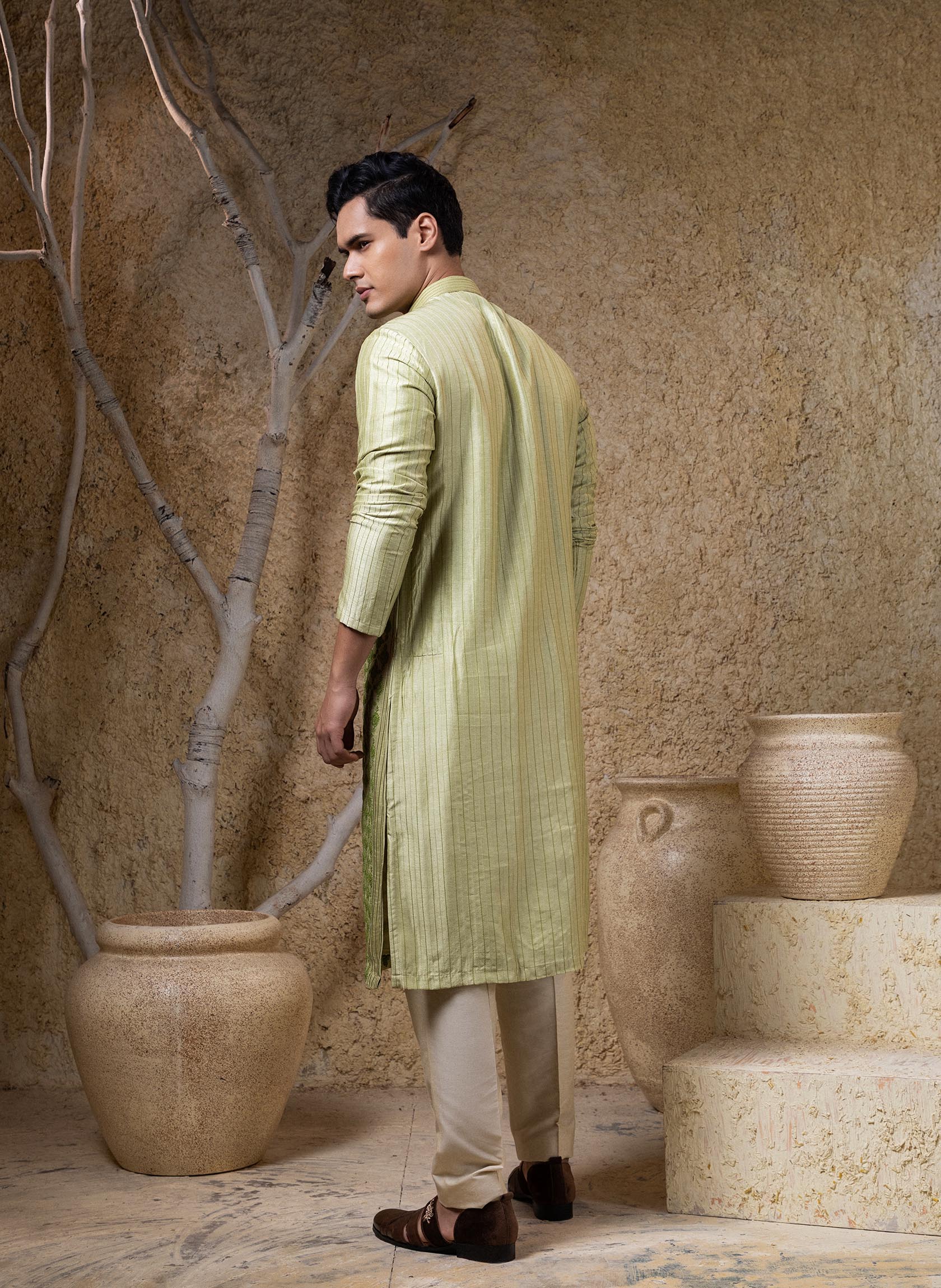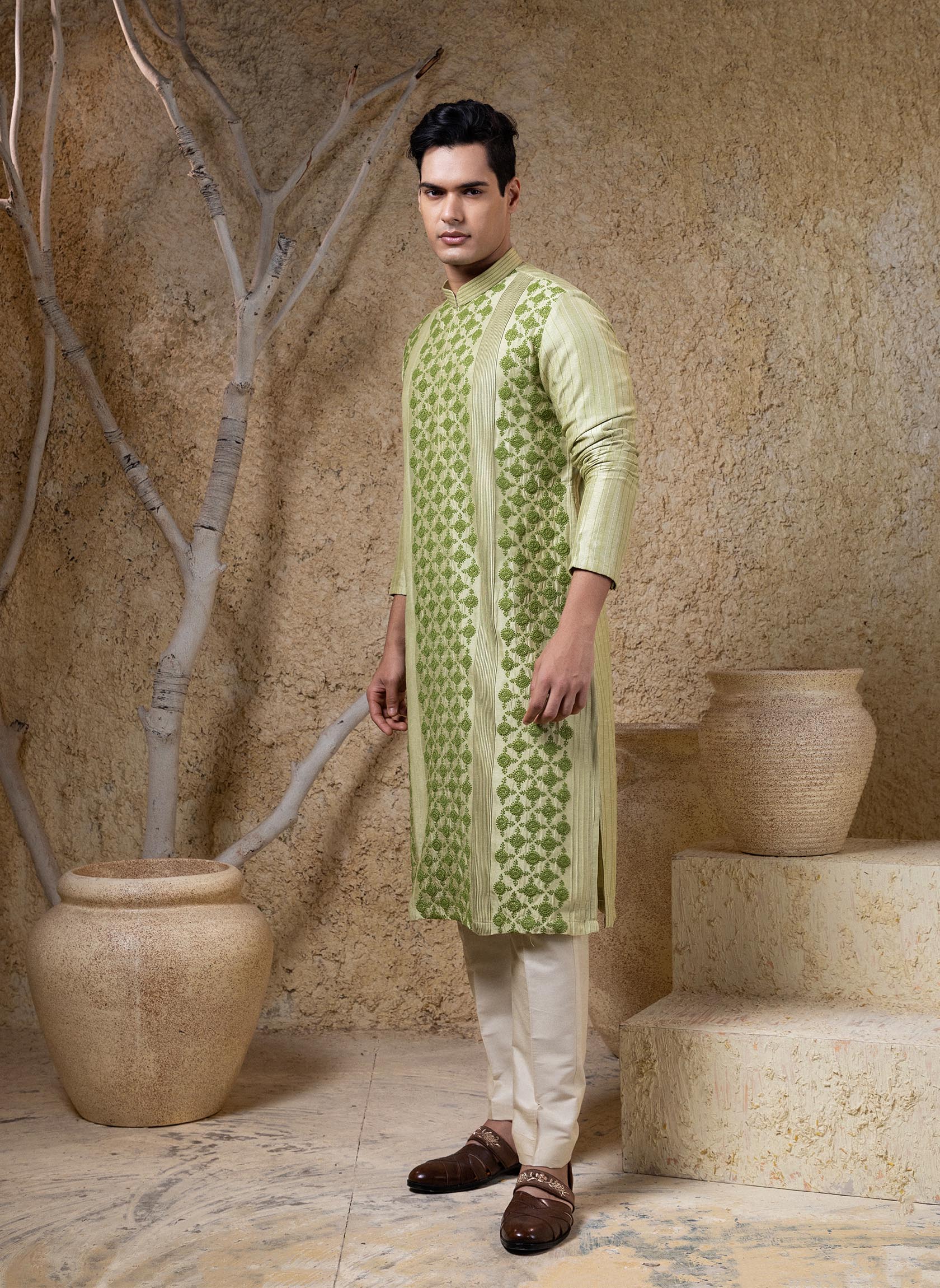 Shaded green Kurta set with floral embroidery in panels alongside pleats. Comes with ivory straight pants.