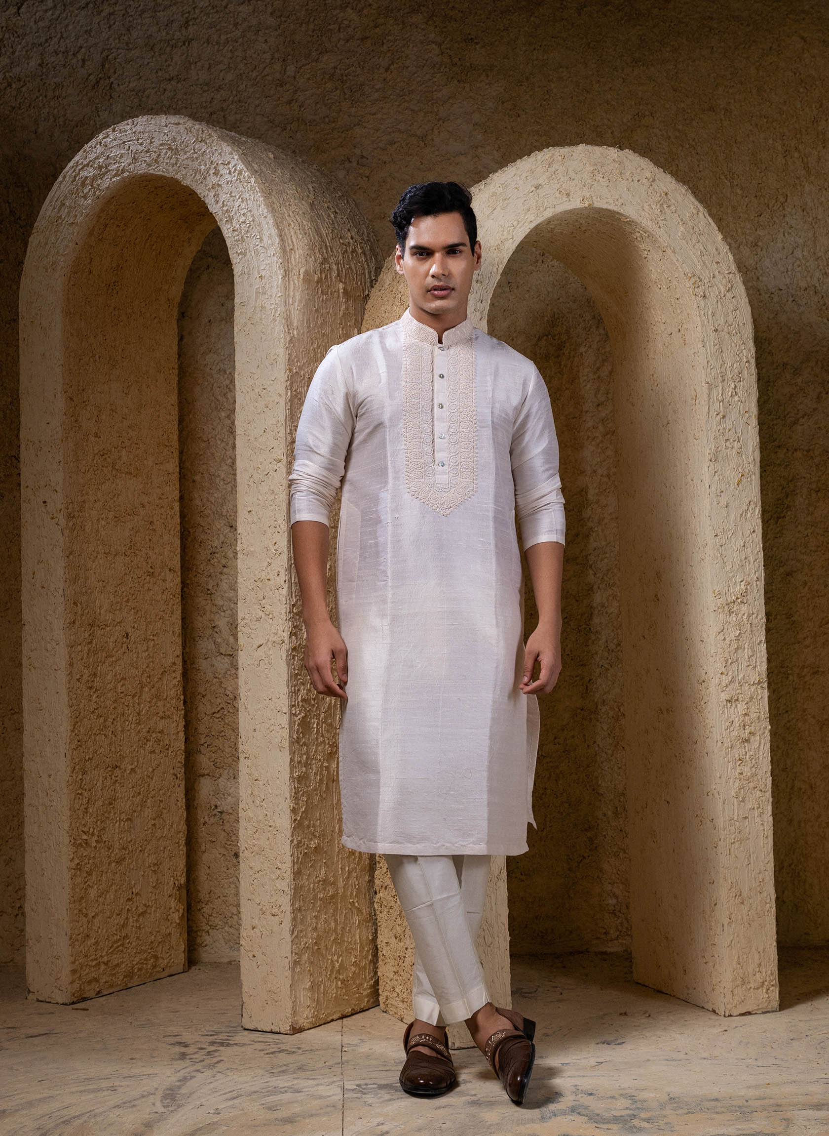 Ivory Raw Silk Kurta with hand embroidery around the neckline. Comes with straight pants with two side pockets and zip opening.