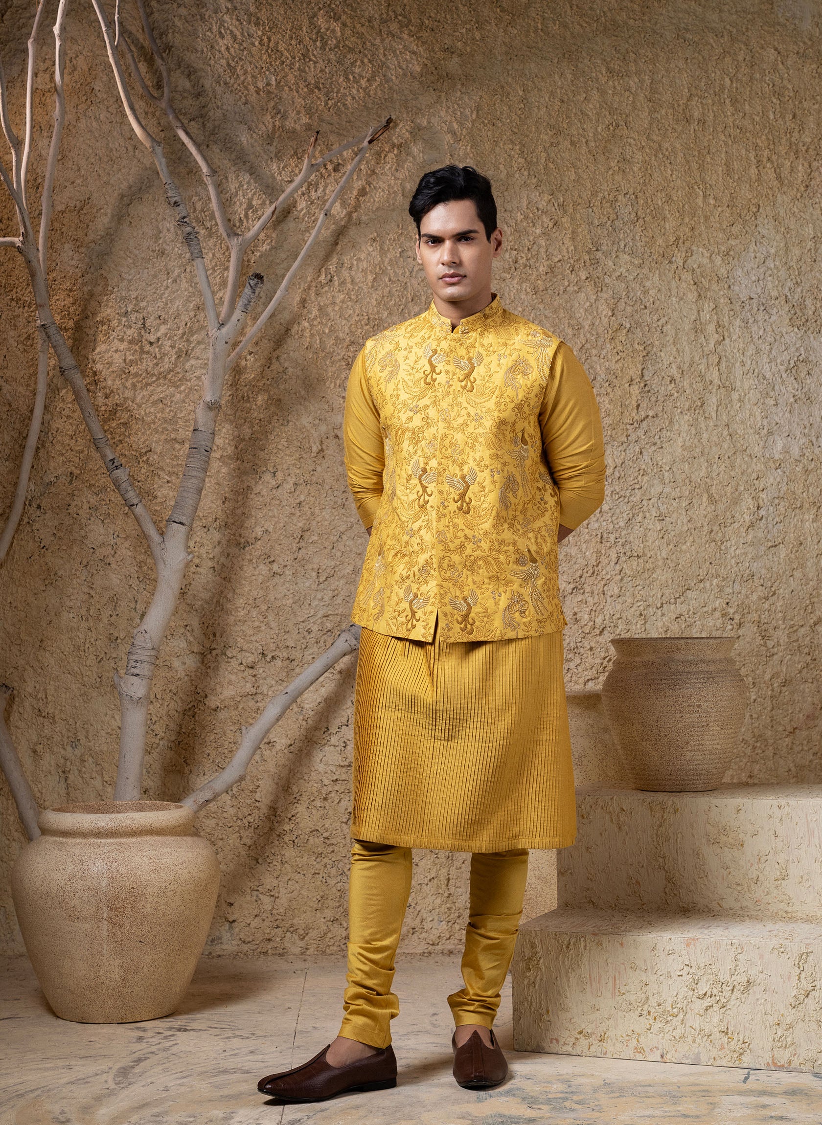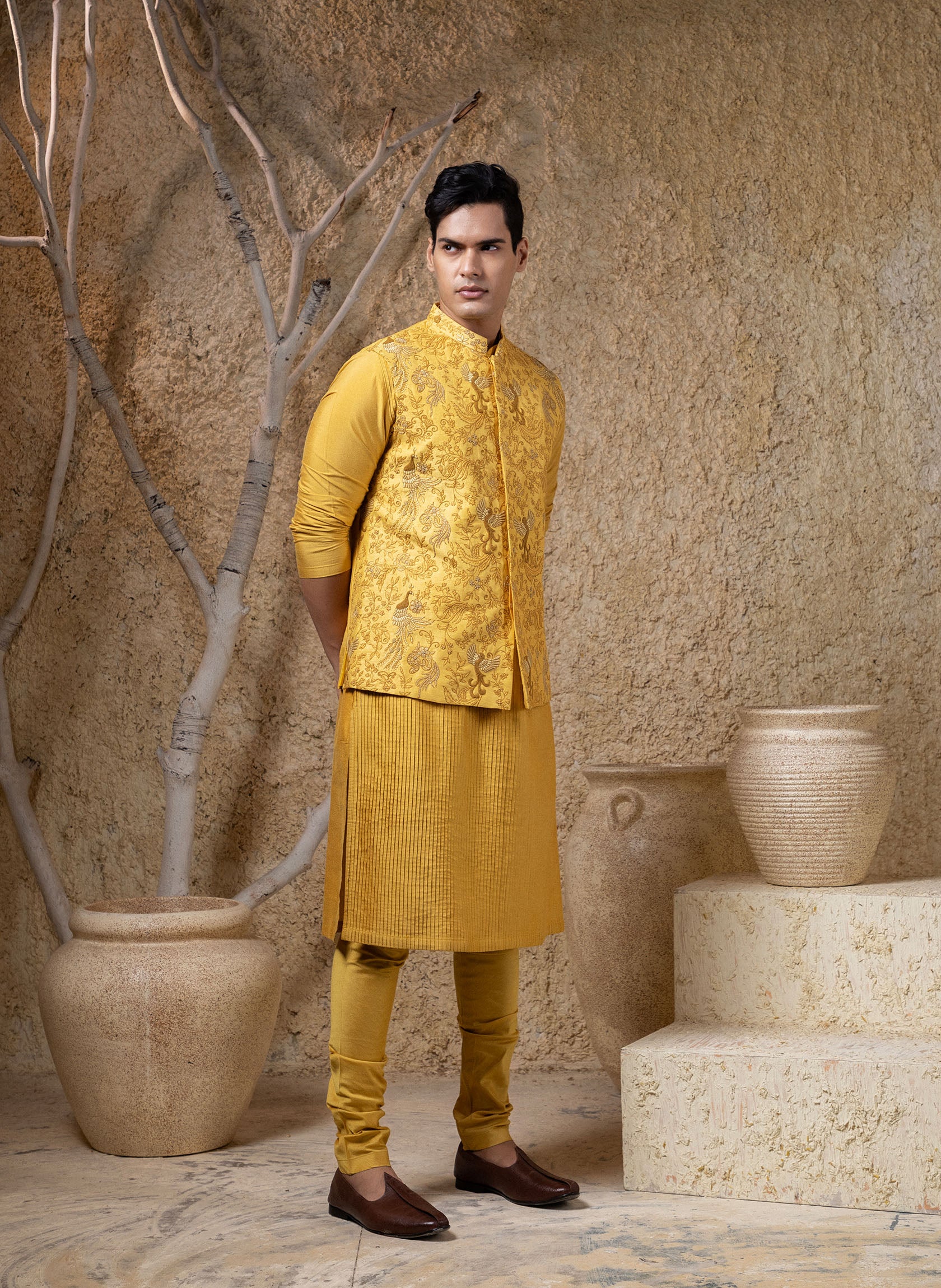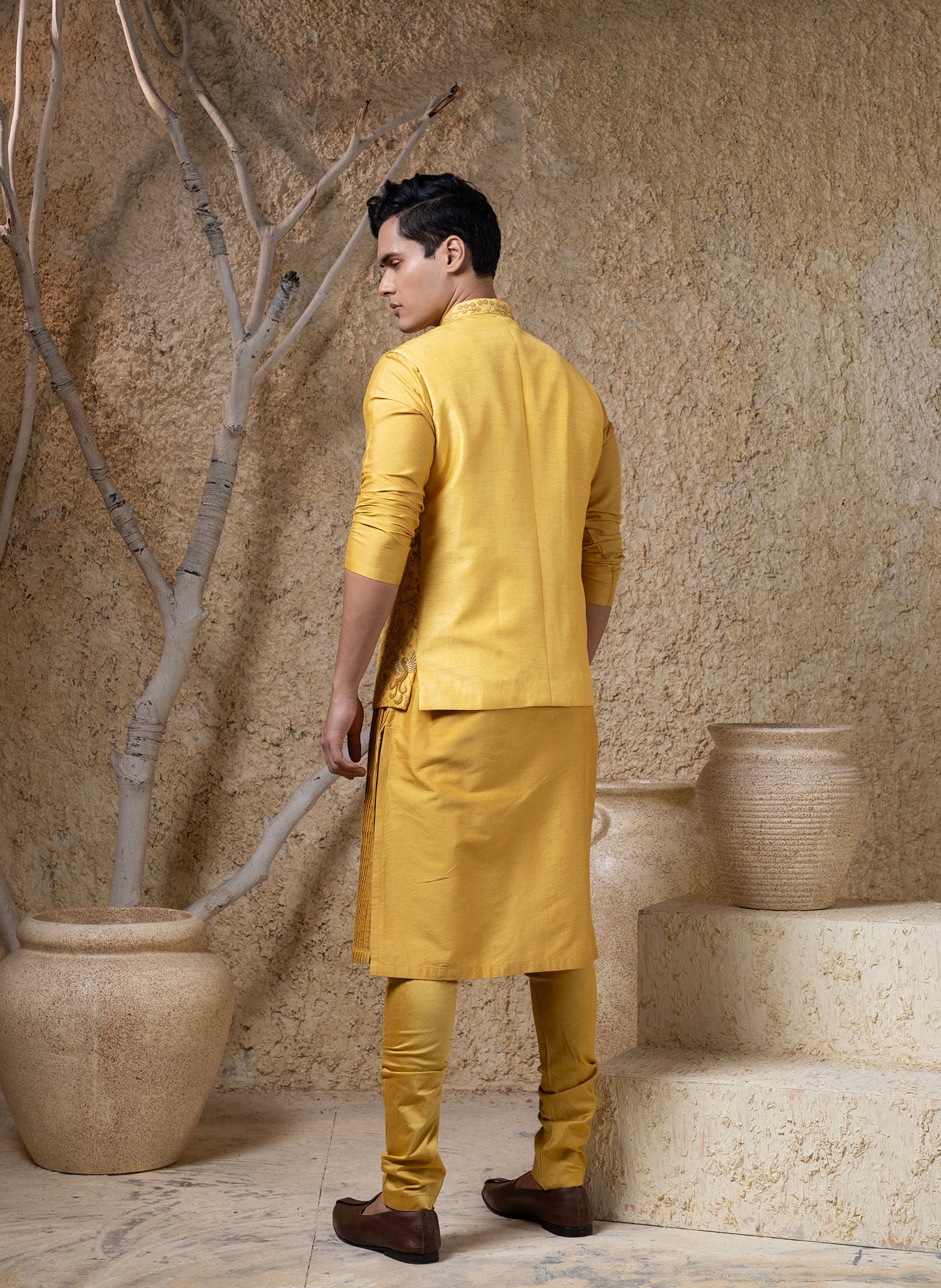 Mustard Hand Embroidered Jacket with sequin embellishment. Comes with pink kurta and straight pants.