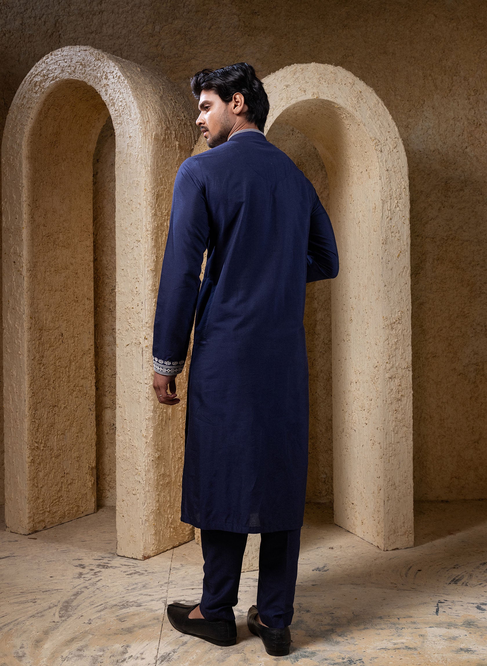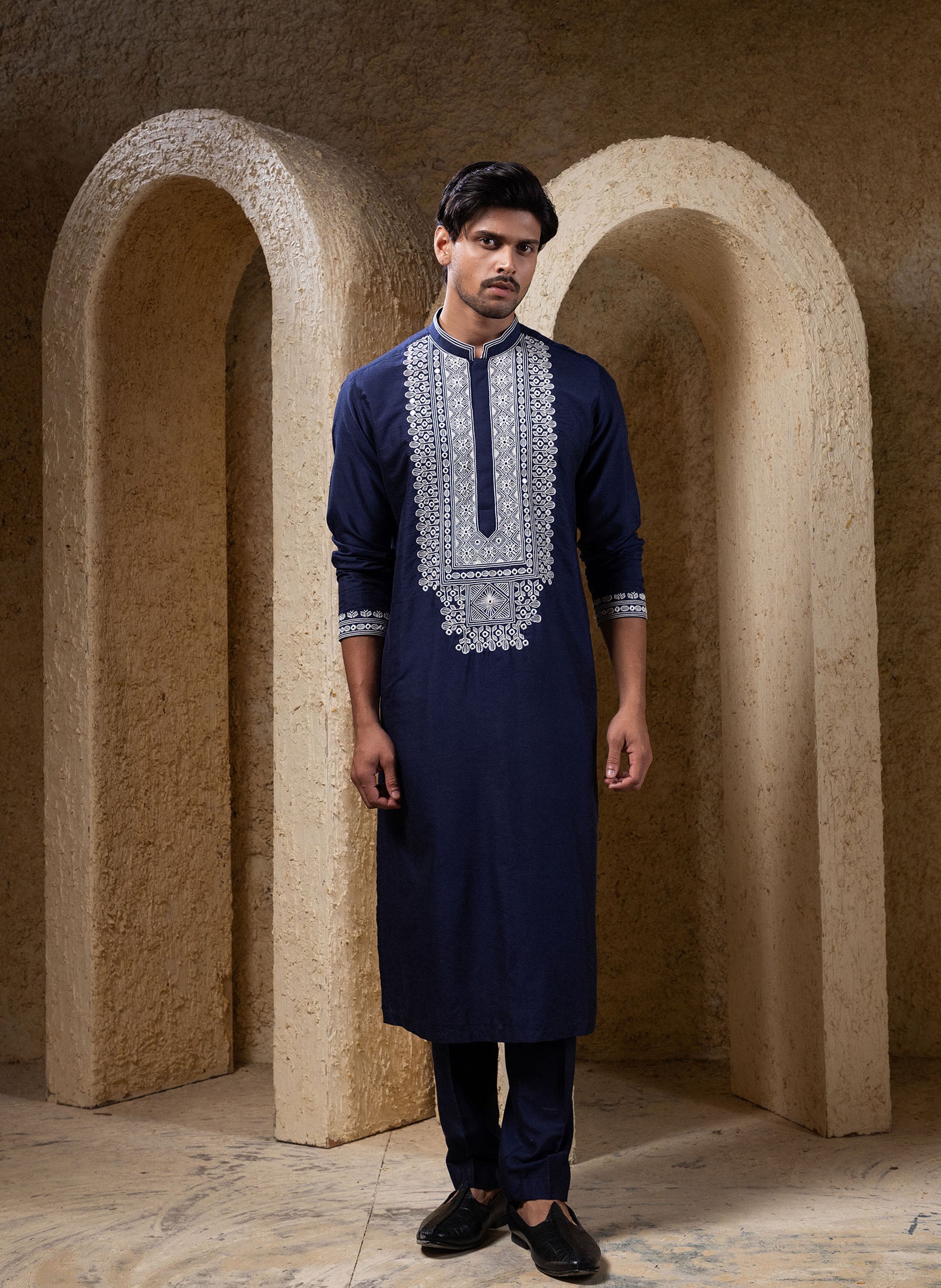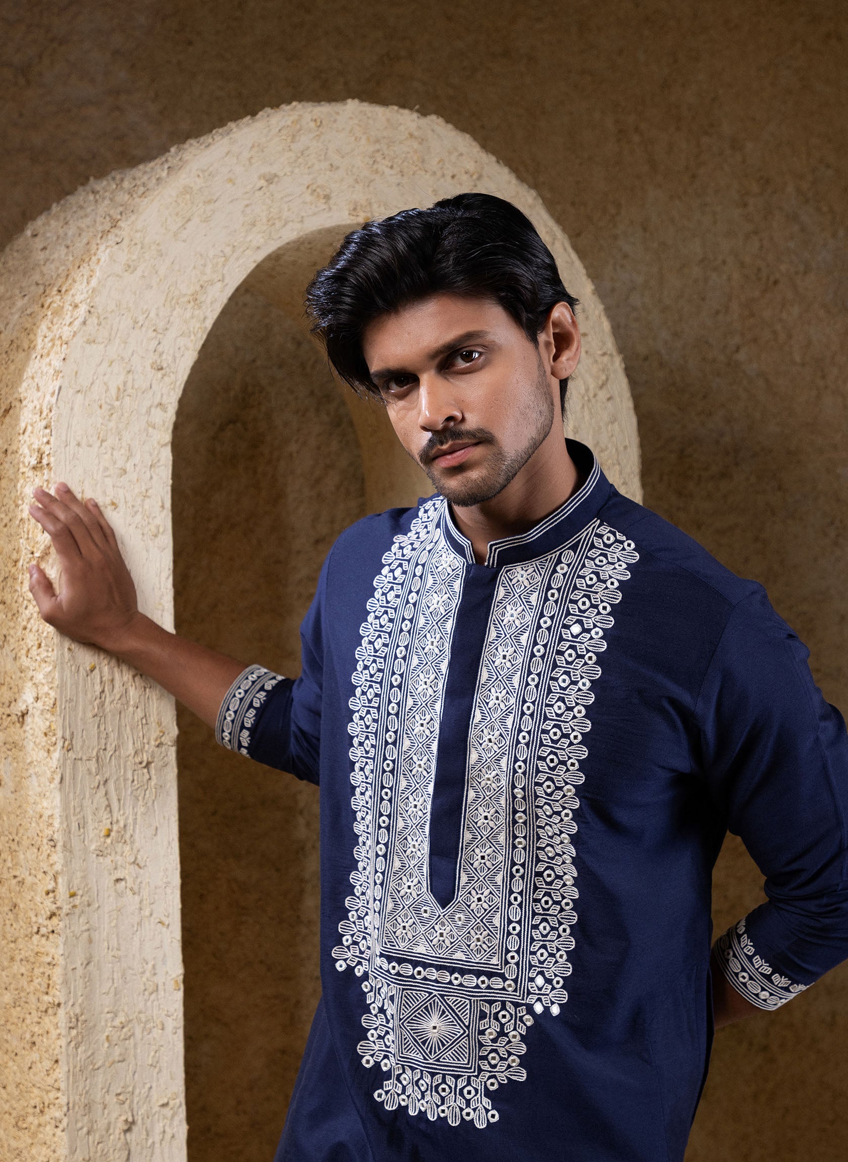 Navy Blue embroidered Kurta with white floral motifs and mirror. Paired with matching churidar.