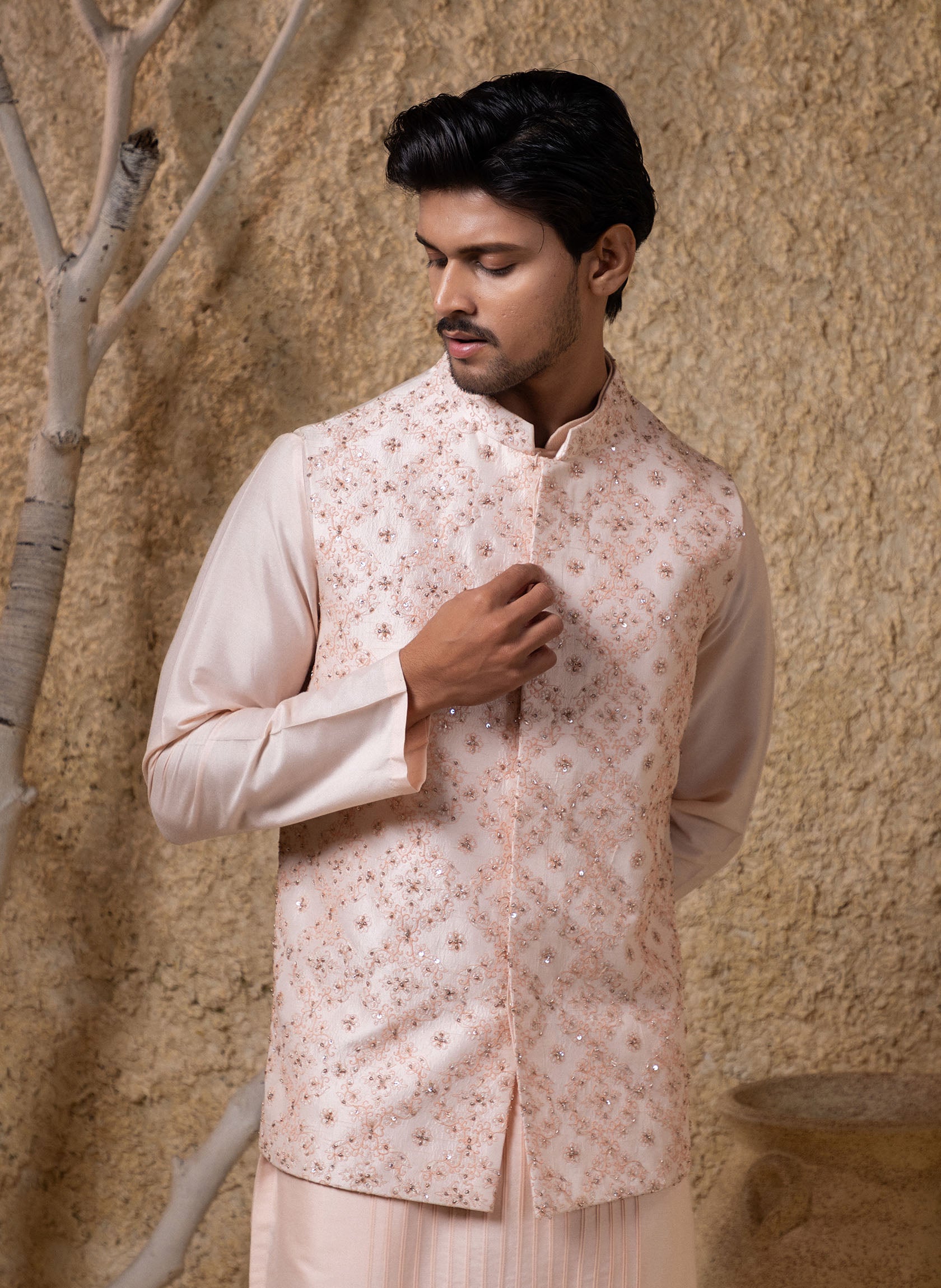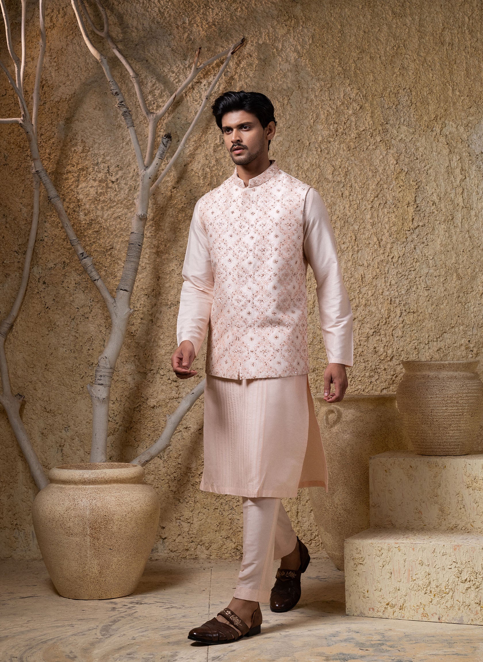 Pink Hand Embroidered Jacket with sequin embellishment. Comes with pink kurta and straight pants.