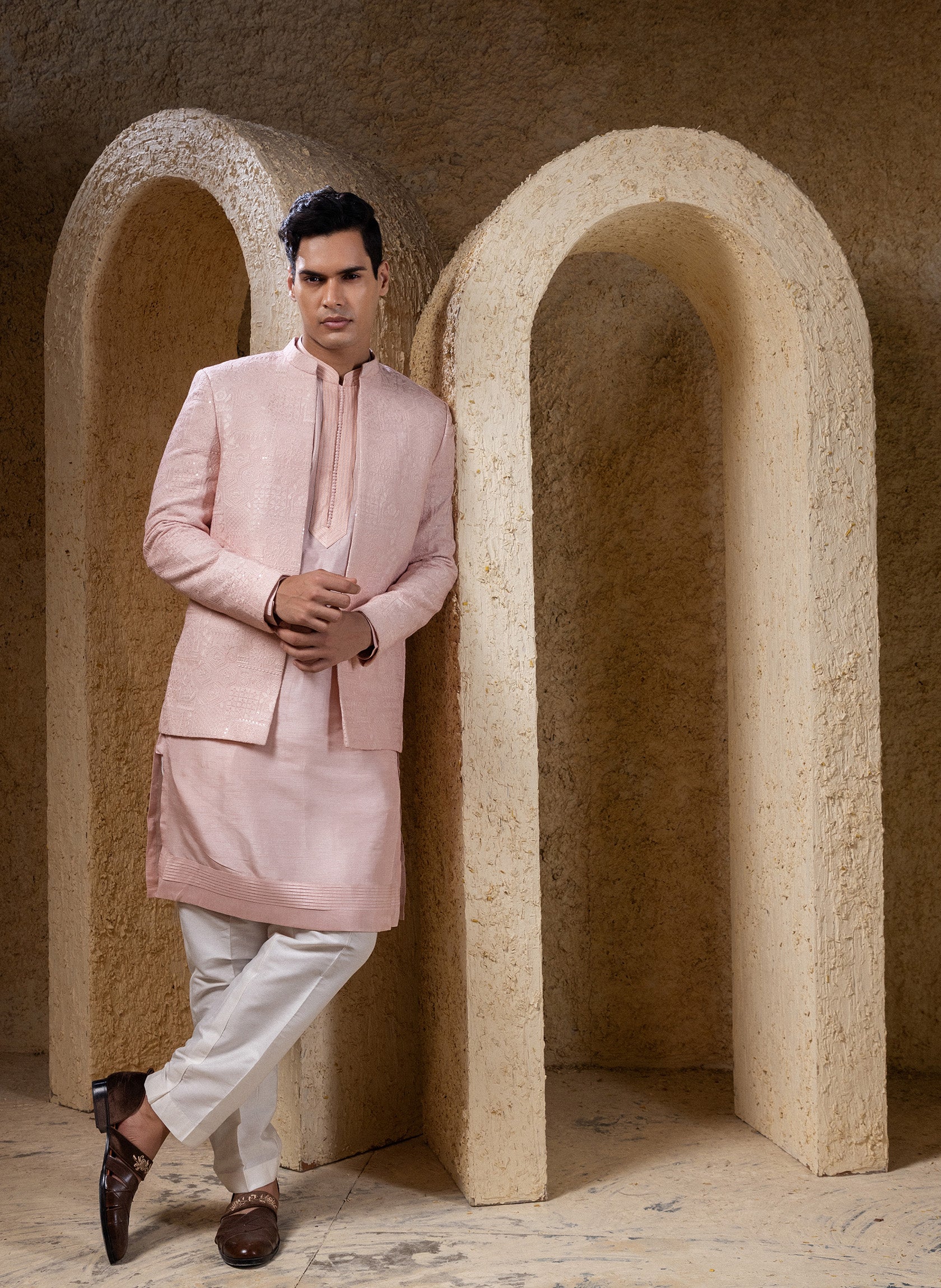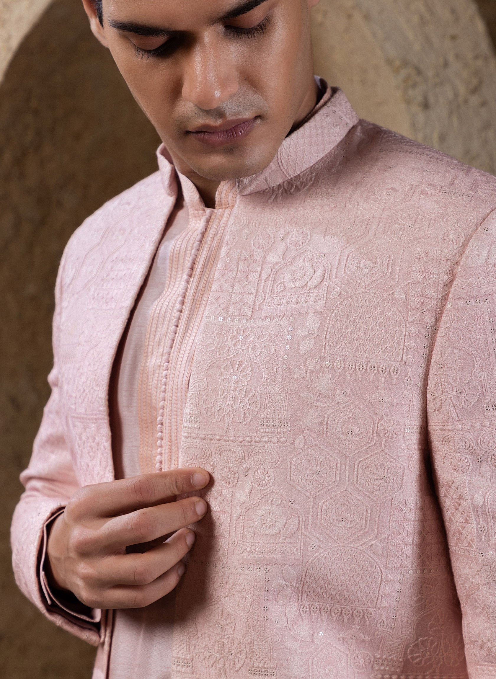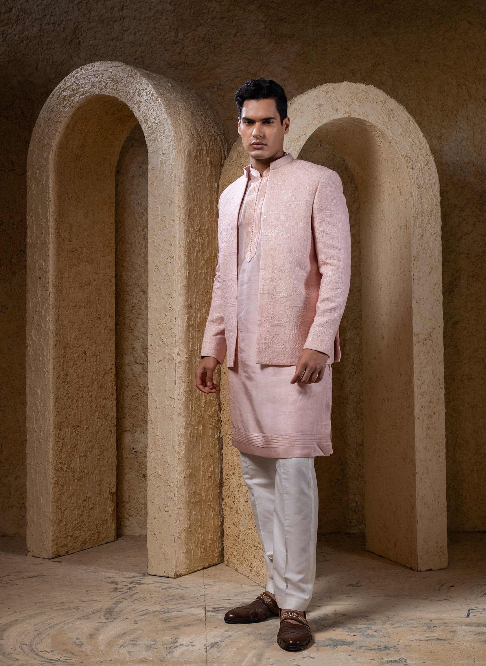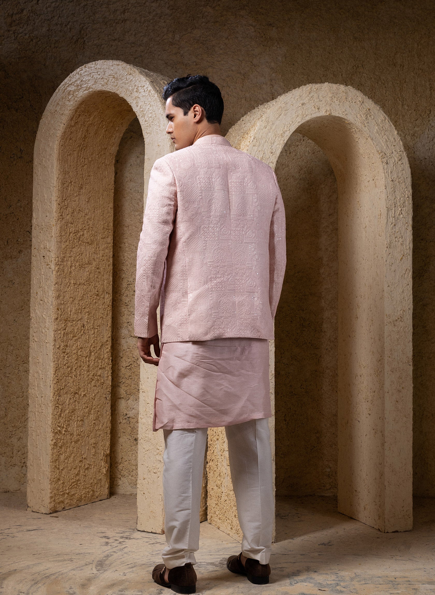 Pink Geometric Embroidered coat with short Kurta and straight pants.