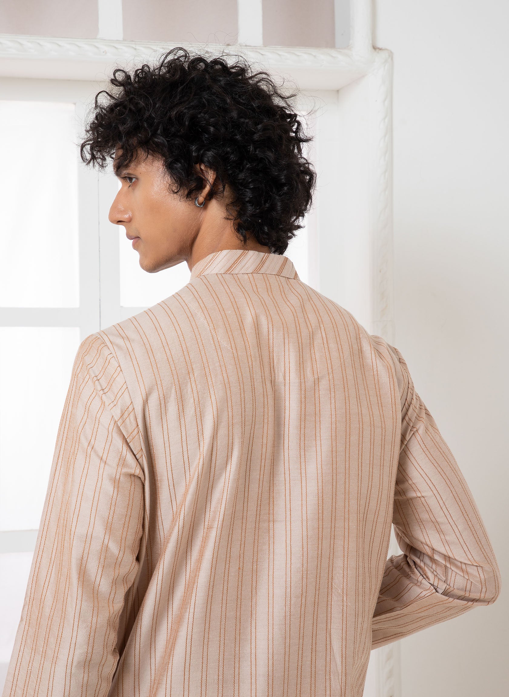 Rose Chevron pattern pintuck with thread line detailing and fabric button placket. This kurta comes as a set with same colored churidar.
