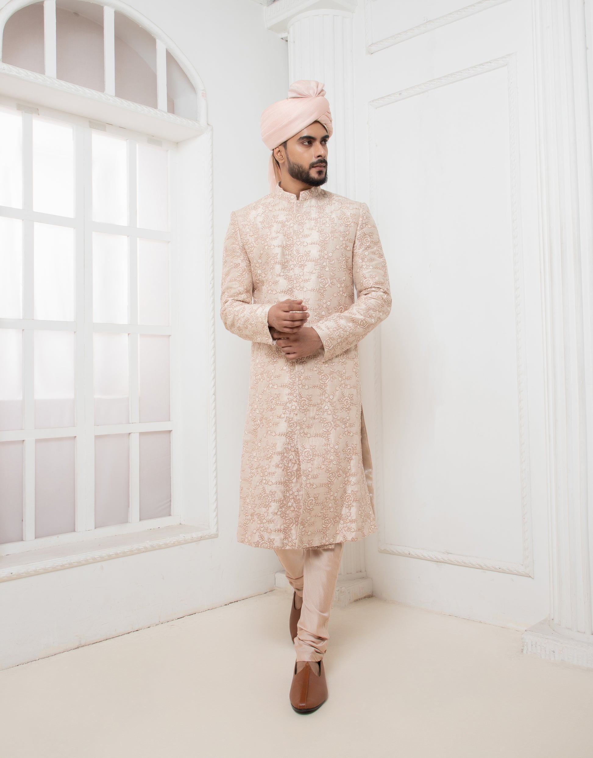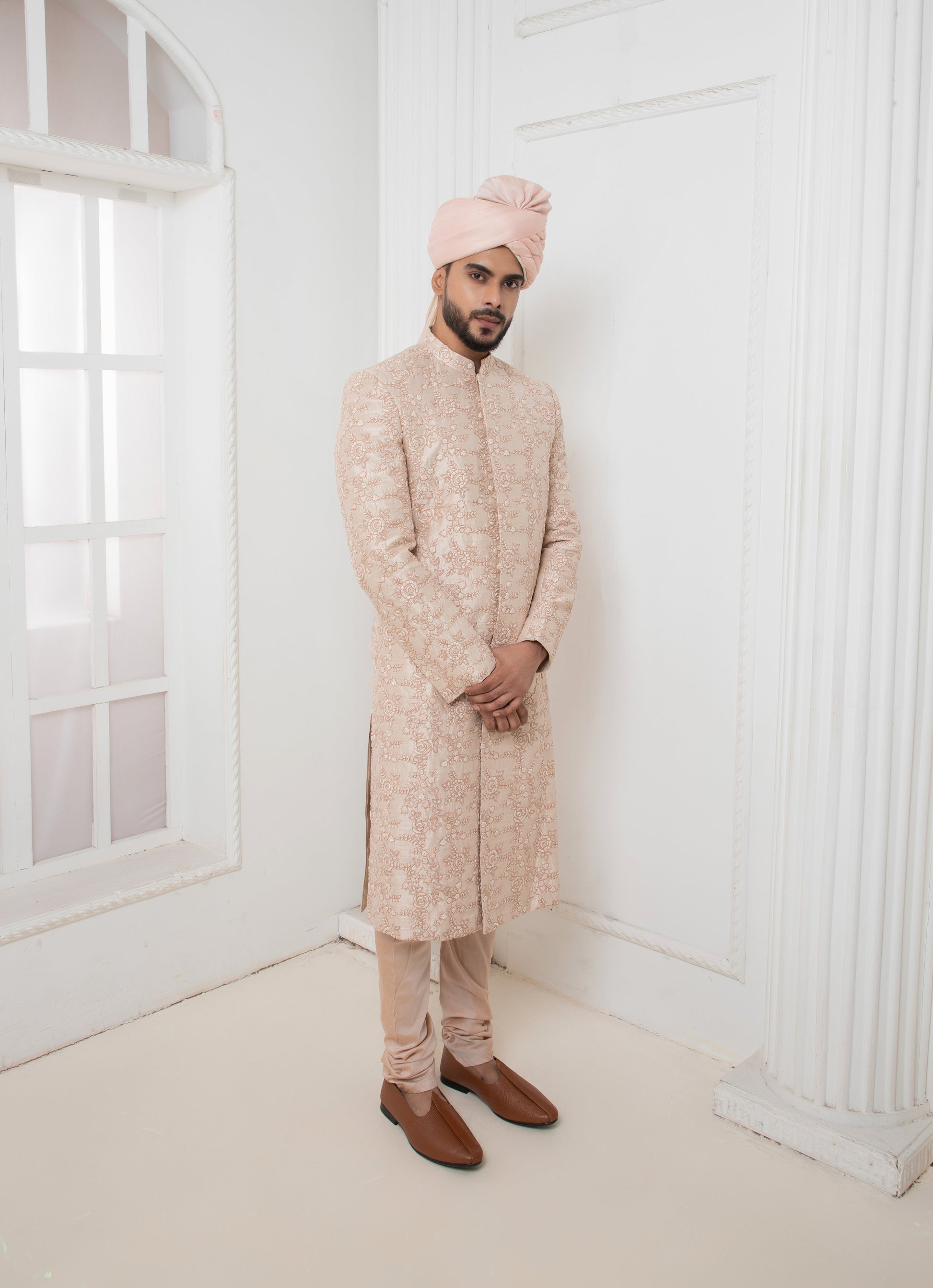 Rose Raw Silk Sherwani with hand embroidered floral motifs. This Sherwani comes as a set with Kurta and churidar.