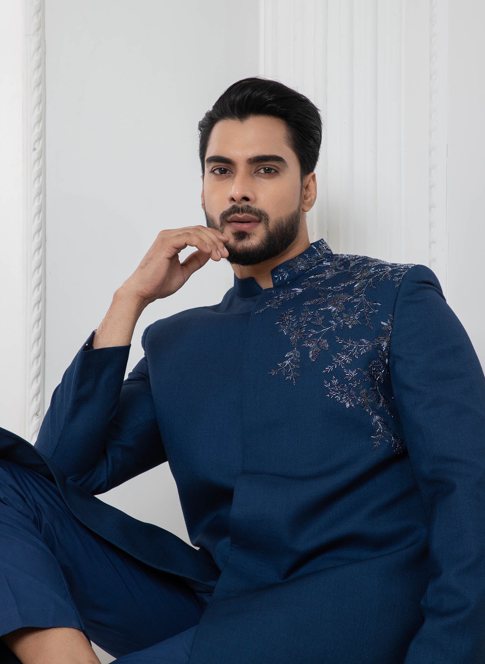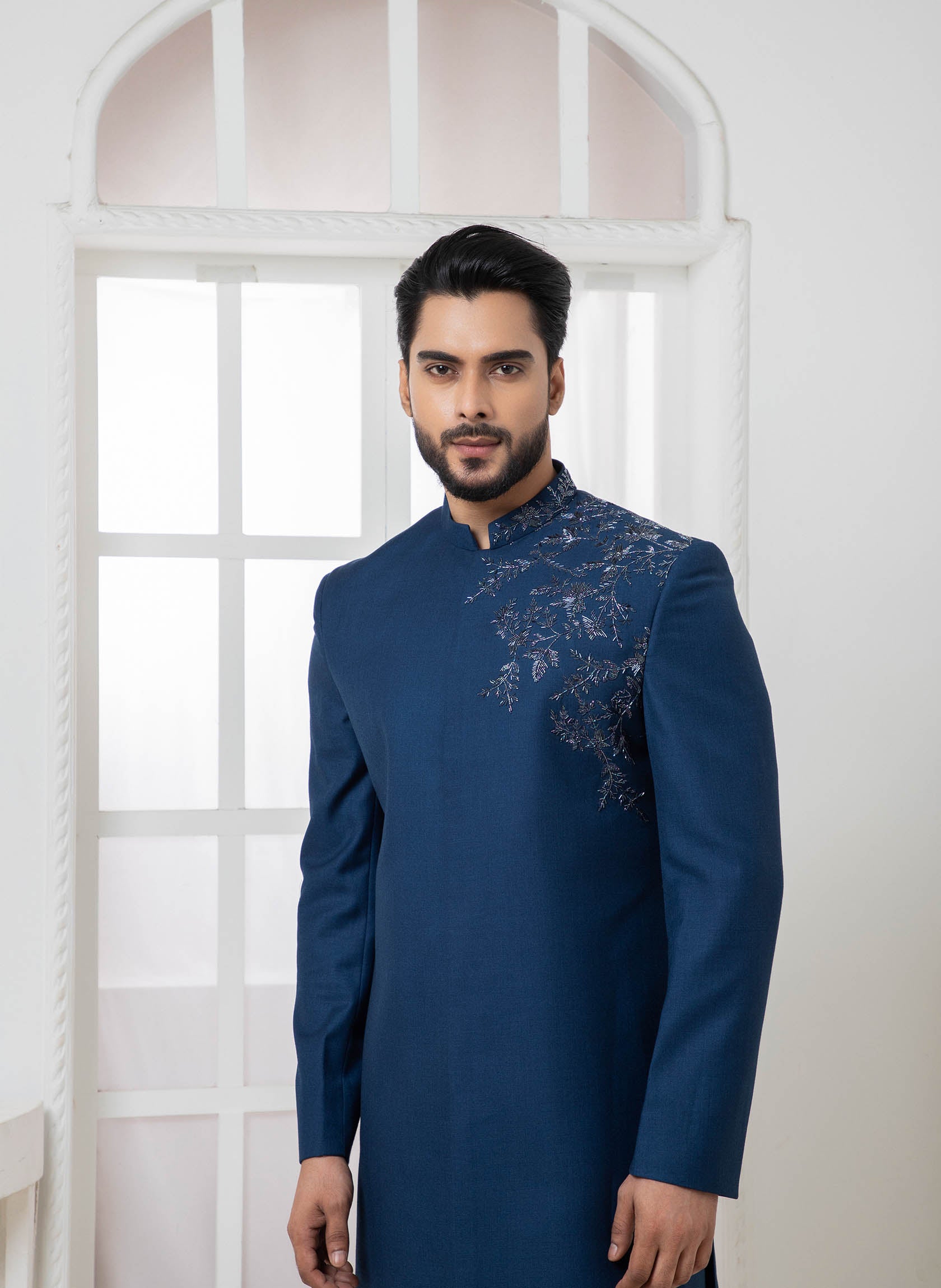 Royal Blue Bandhgala with one side motif with chrome cutdana. Comes with Straight Pants.